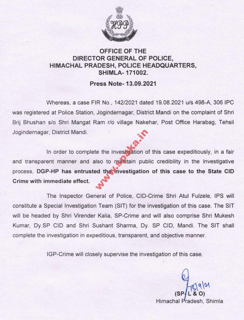 जोगिंदर नगर की विवाहिता युवती की संदिग्ध मौत की जांच, अब हिमाचल प्रदेश पुलिस की अपराध जांच विभाग(CID) की टीम करेगी।